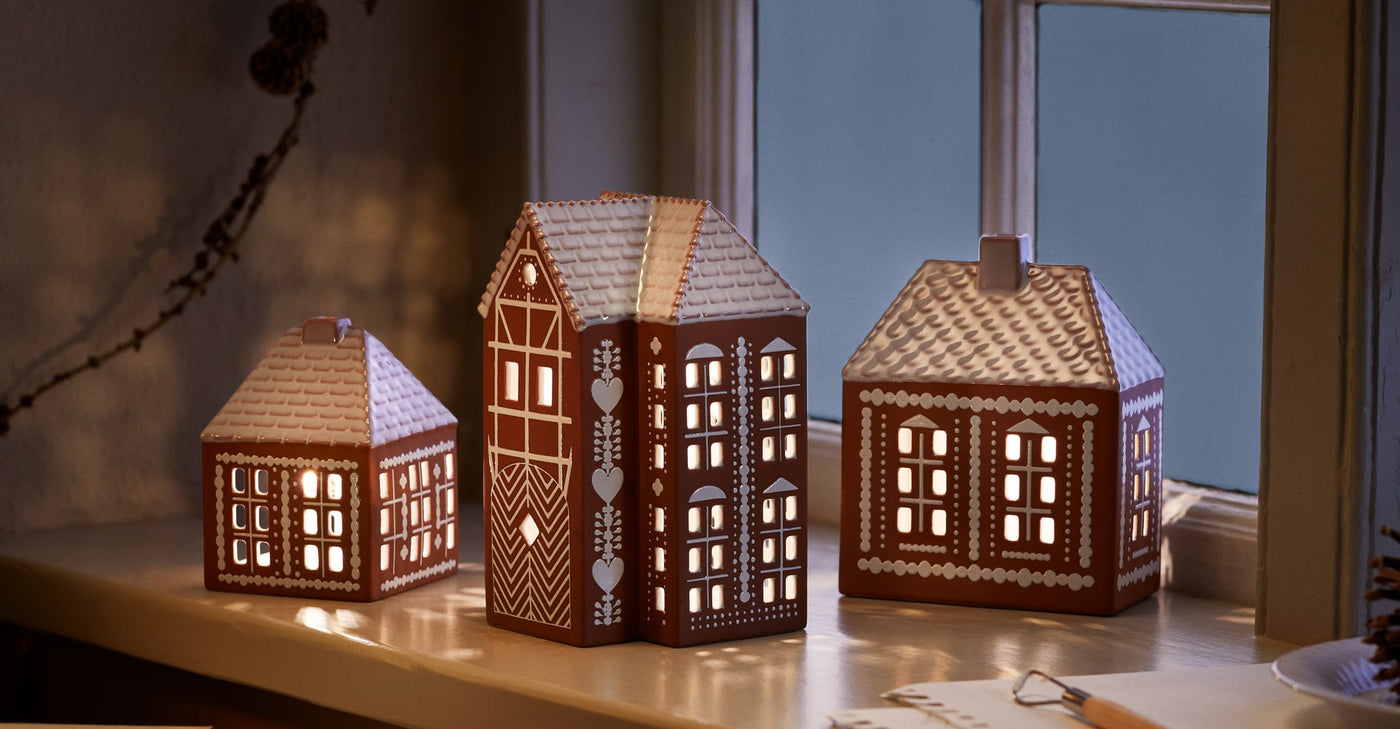 Kähler Gingerbread is a modern gingerbread house from Kähler, where the combination of a charming expression and handmade design traditions meets the warmth of the tealights creating both style and coziness—"hygge"—on dark December evenings.