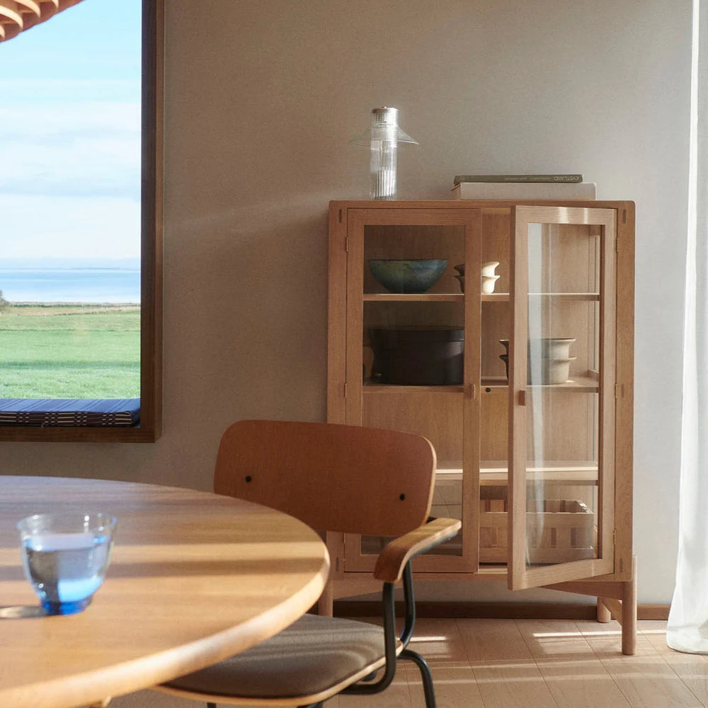 The designer Rasmus Appel presents his take on what a wooden display case should look like in a contemporary and simple design. Rasmus Appel, who trained as an industrial designer at the Royal Danish Academy of Fine Arts, School of Architecture, is from Bornholm, and is inspired by the boat-building and the beautiful oak dinghies which are known for their fine proportions, construction and joints. The result is the display case Boderne, a simple piece of furniture that will grace any home. It also provides practical storage space with several different options with regard to both functionality and positioning.