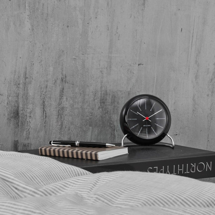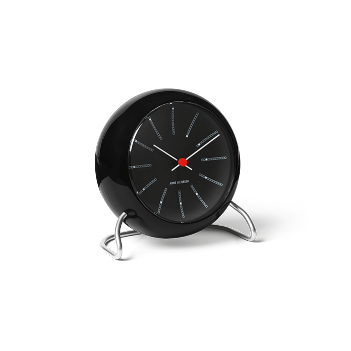 The sleek Bankers clock was designed in 1971 specifically for the National Bank of Denmark. In 1978, when the building was complete, the Bankers Clock was given pride placement in the 65.6 ft. high foyer. This unique table clock expresses Danish design in a neutral, yet richly detailed fashion. It will be the perfect decorative and minimalistic design piece for your interior. The table clock's features include an alarm, snooze and light sensor. The third hand of the clock is used to set the alarm.