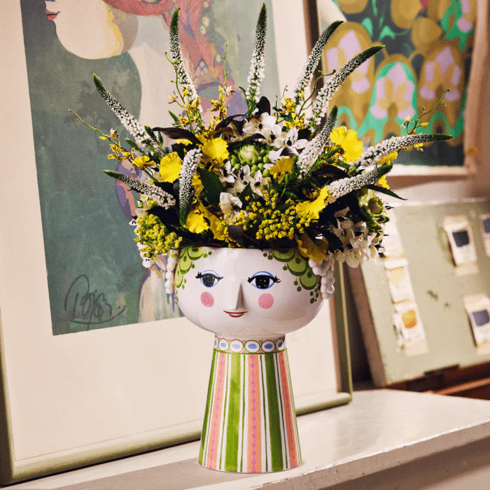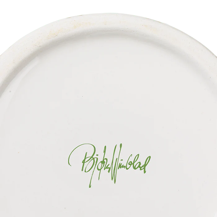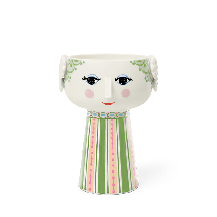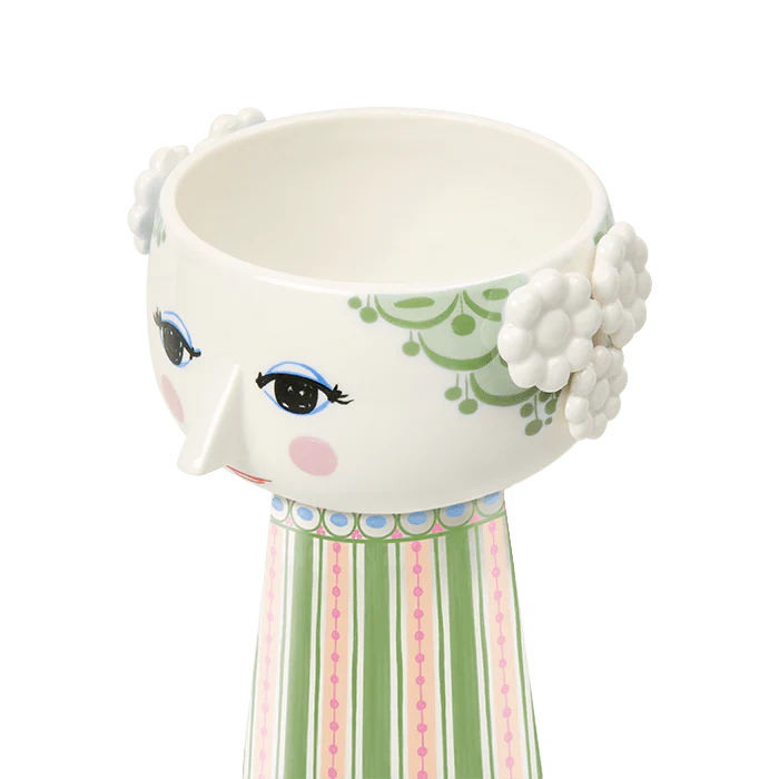 Bjørn Wiinblad embodies everything quirky, whimsical, creative, and wonderful. With the beautiful and smiling Eva vase from Bjørn Wiinblad, featuring vibrant green hair, a blue pearl necklace, and a colorful dress in green with pink hues, you can bring a touch of whimsy into your home. The vase stands 9.3" tall with a diameter of 6.9" and is made of glossy glazed ceramic. The face, with almond-shaped eyes and a pointed nose, reflects Wiinblad's original design, while the colorful dress pattern reinterprets illustrations from Bjørn Wiinblad's archives.