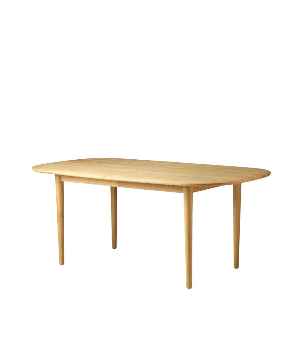 The dining table in the Bjørk collection is designed to strike a balance between tradition and innovation, a recurring theme throughout FDB Møbler’s history. The table suits both large dining rooms and small urban kitchens. The rounded shape and the oak create a unique and contemporary look. At the same time, it’s part of FDB Møbler’s design heritage, and can equally well be matched with some of the classic dining chairs from the company’s first golden age. The table is crafted from solid, FSC®-certified oak wood. Minor knots and the intrinsic grain of the wood are integral features of this natural material. Please note before purchase: If you wish to purchase extra leaves in nature oak, you must buy two pcs together with the table. This way, we can ensure that the wood is of the same grade and deliver the high quality you expect from FDB Møbler. We do sell extra leaves separately, should you wish to wait, but please note that these can only be delivered in black or grey painted beech.