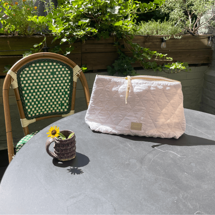 Measuring 12" x 8" x 4", the Karla toiletry bag is a large, quilted bag perfect for longer trips - toiletries, documents, stationery, electronics, or whatever you need to keep together and accessible. In 100% organic, GOTS-certified cotton, upcycled from surplus fabric from bedding production, the Karla bag is as practical as it is sustainable, and as stylish as it is versatile.