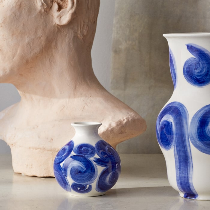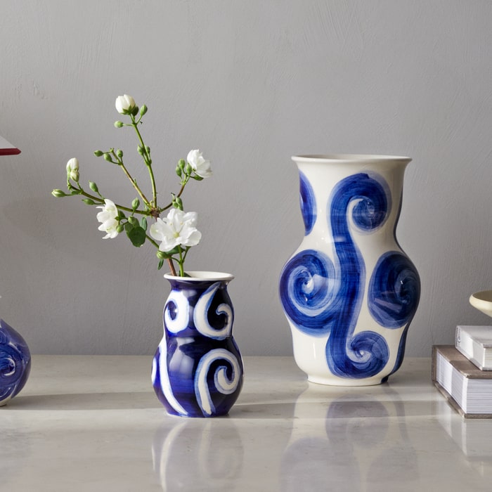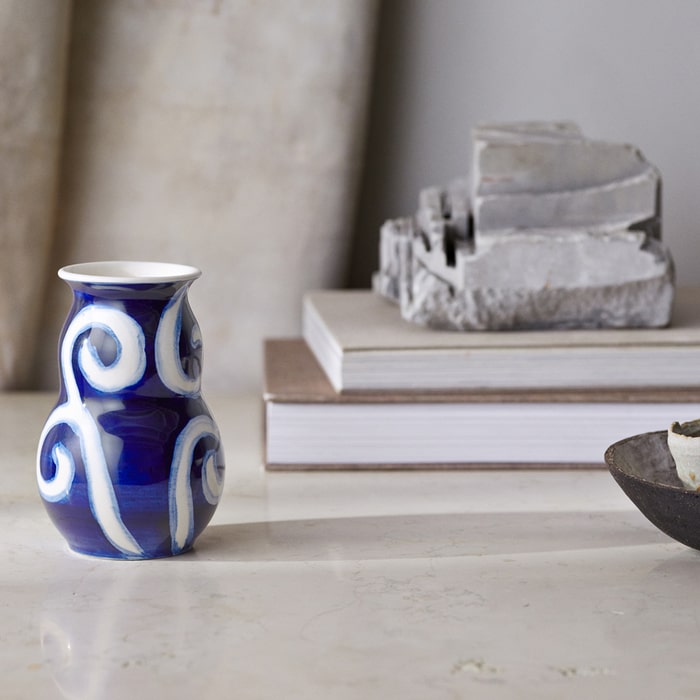 The smallest of the Tulle vases, this 4.1" tall vase has a creamy white base color and is painted with spirals in a cobalt blue clay, which has then been glazed. The neck of the vase is kept free of the blue brush strokes and therefore appears simple and clean. The vase has a beautiful authentic and artistic look in a modern context. It is small in size, however, it has been given extra depth and life through deep, rich glazes, which originated in the old Kähler workshop.