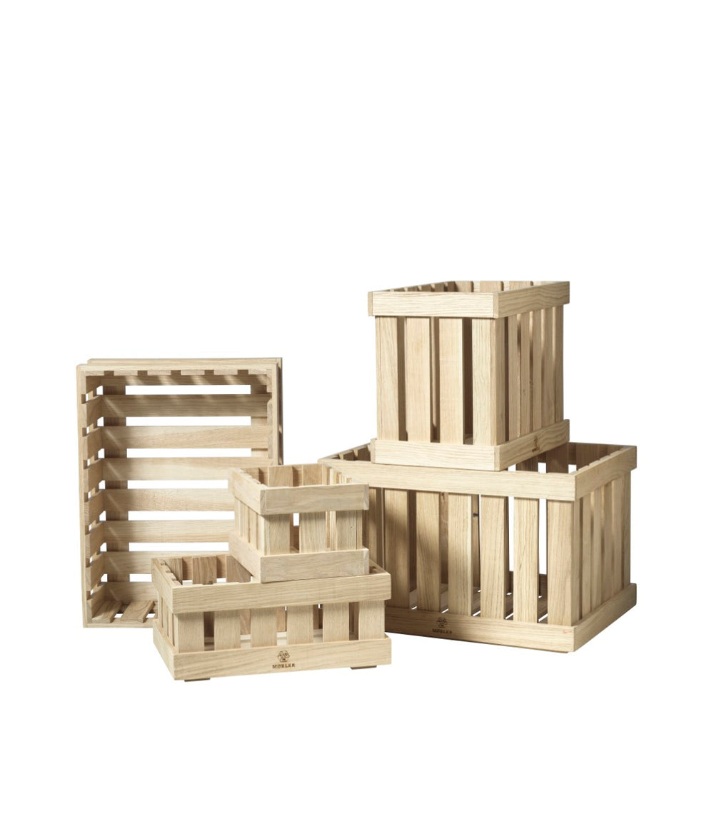 The beautiful Æbletoft boxes are designed by Monica Ritterband. They are a modern take on the classic apple boxes that Danes have known and harvested fruit in for generations. Stackable and useful for storing and organizing large and small items both indoors and outdoors, Æbletoft boxes come in five different sizes that can be combined to suit your needs. The boxes are made from solid oak and have a beautiful, vibrant surface.